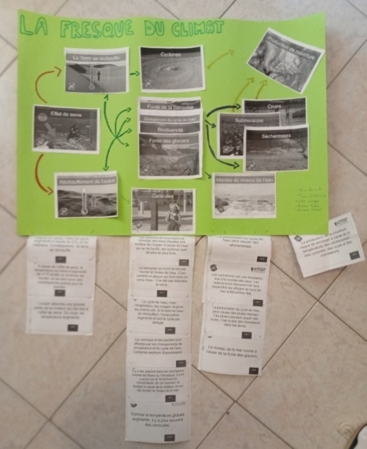 À travers la réalisation d’une fresque, chaque groupe a exploré les causes et les conséquences des activités humaines sur l’environnement. Ce travail a également été l’occasion de développer leurs compétences linguistiques, puisque les élèves ont dû traduire leurs idées et organiser leurs recherches afin de créer des affiches claires et informatives.
