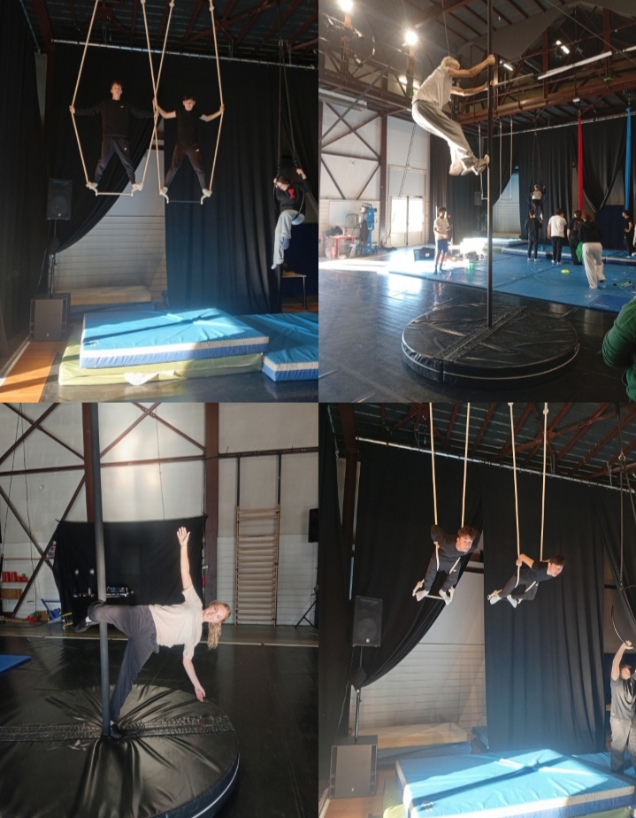Sur le trapèze, nous avons essayé des figures telles que l'aviateur ou l'étoile. Ensuite, avec les tissus, nous avons testé le sac à dos et, sur le cerceau, la figure Pierrot la lune. Bien que physiquement c'était dur et que la hauteur faisait peur, nous avons aimé.